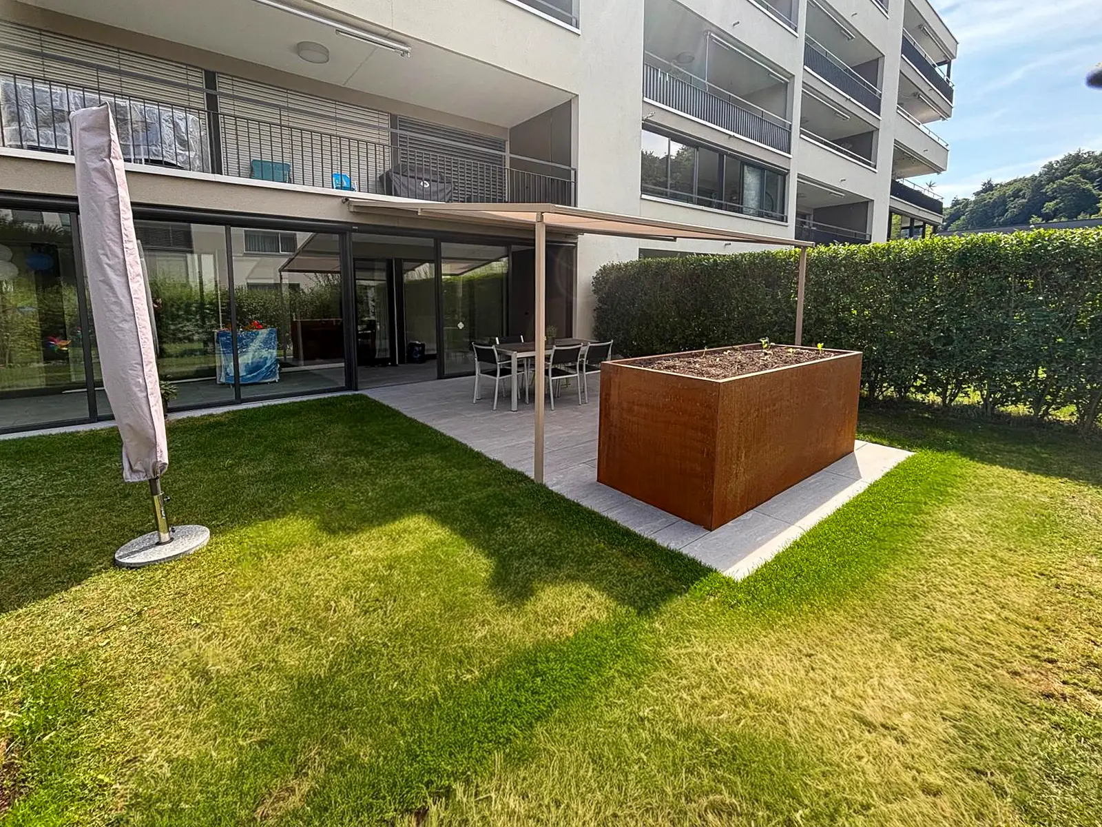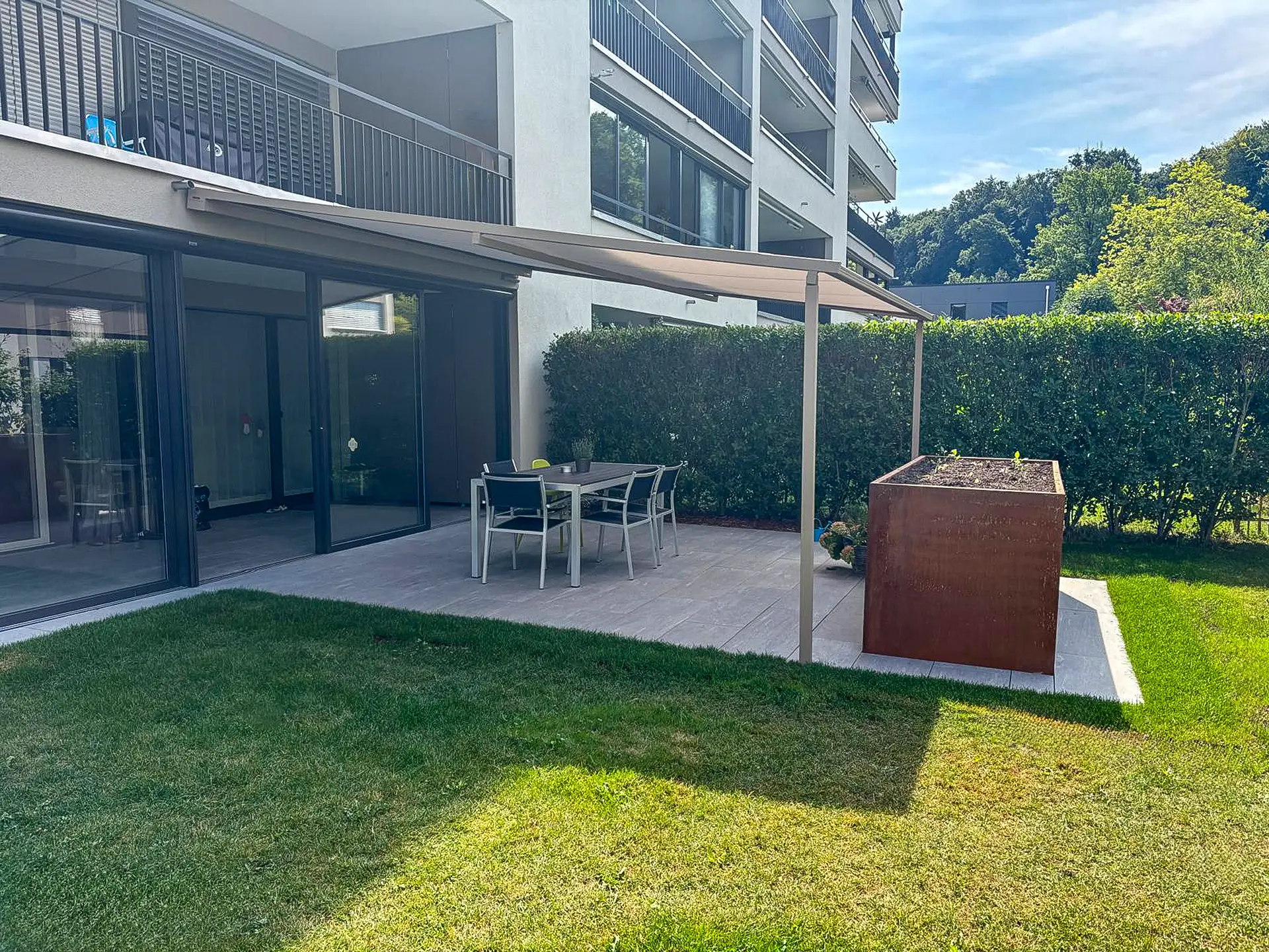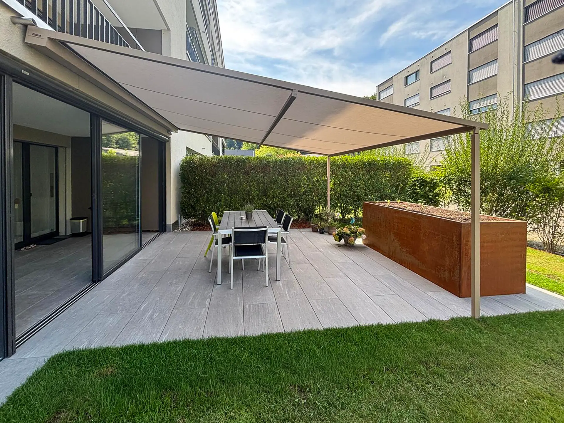 Bei diesem Projekt hat Jardin Dominé dem alten Sitzplatz mit Verbundsteinen ein Upgrade verpasst und gleich den ganzen Sitzplatz vergrössert. Statt grau und müde gibt’s jetzt edle Feinsteinplatten – chic wie ein Pariser Balkon, aber viel gemütlicher. Dazu ein integriertes Hochbeet aus Cortenstahl, das aussieht, als hätte es schon immer dort hingehört. Und weil man im Sommer nicht schmelzen möchte: eine elegante Beschattung, die Schatten spendet und trotzdem très léger wirkt. Ein Sitzplatz, der jetzt sagt: «Setz dich, geniesse – und merci fürs Schönmachen.»