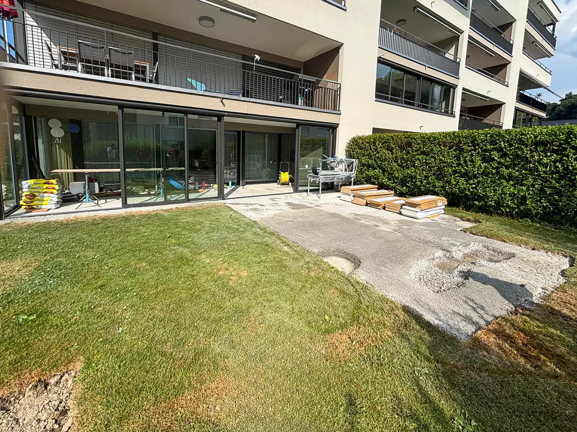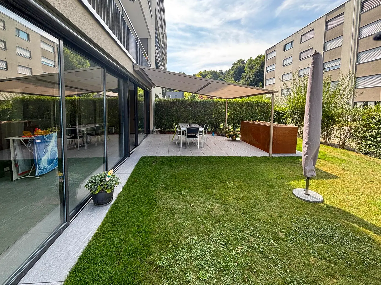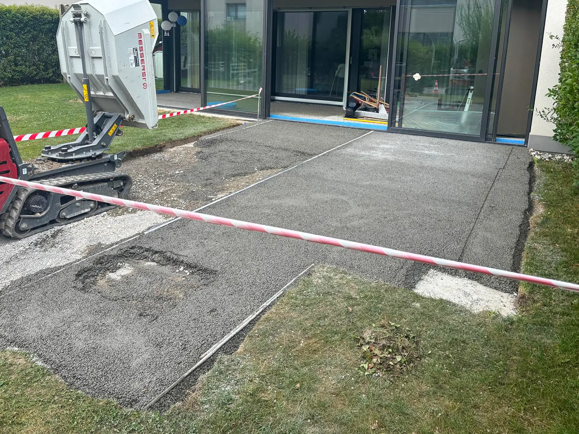 Bei diesem Projekt hat Jardin Dominé dem alten Sitzplatz mit Verbundsteinen ein Upgrade verpasst und gleich den ganzen Sitzplatz vergrössert. Statt grau und müde gibt’s jetzt edle Feinsteinplatten – chic wie ein Pariser Balkon, aber viel gemütlicher. Dazu ein integriertes Hochbeet aus Cortenstahl, das aussieht, als hätte es schon immer dort hingehört. Und weil man im Sommer nicht schmelzen möchte: eine elegante Beschattung, die Schatten spendet und trotzdem très léger wirkt. Ein Sitzplatz, der jetzt sagt: «Setz dich, geniesse – und merci fürs Schönmachen.»
