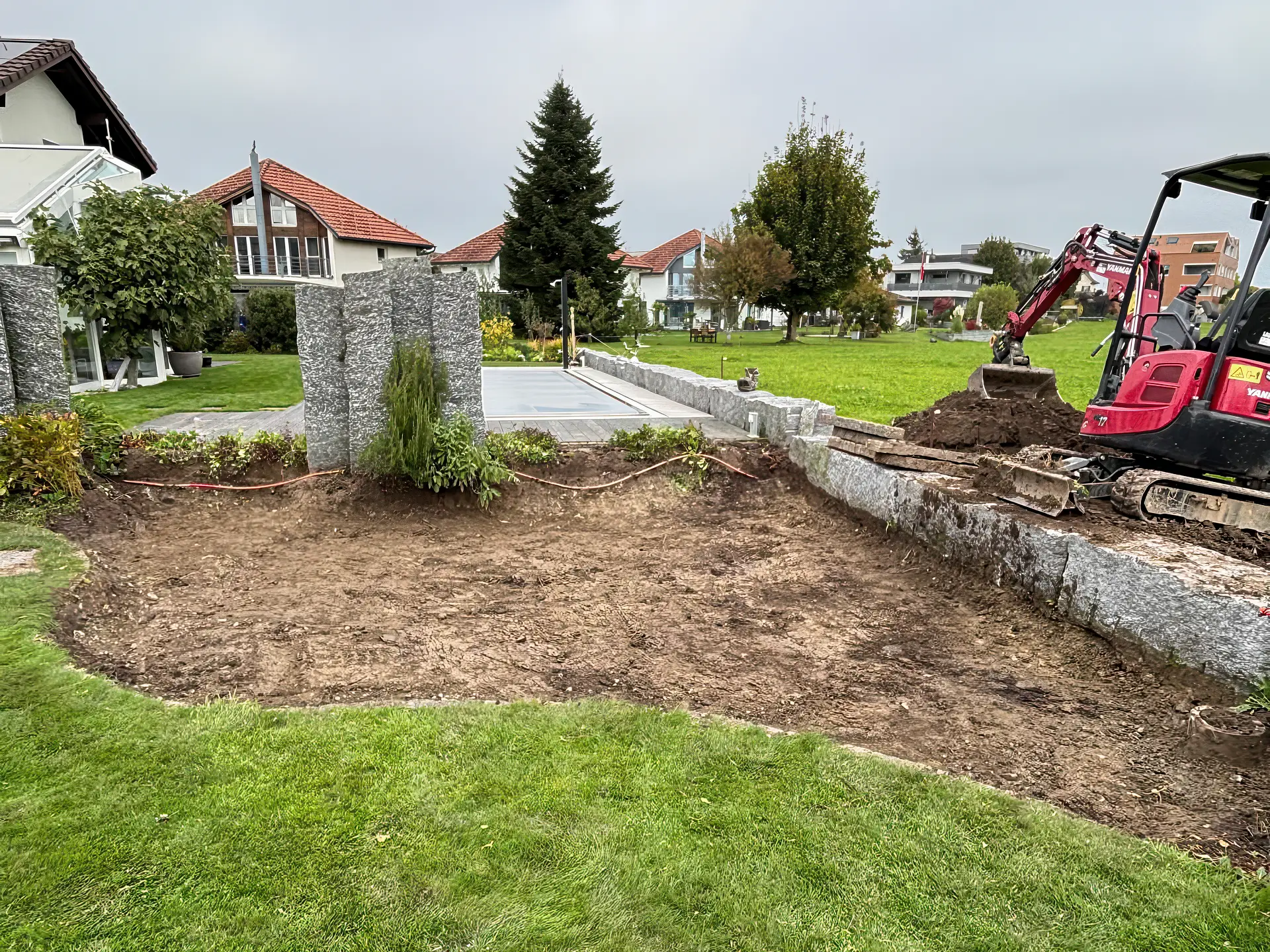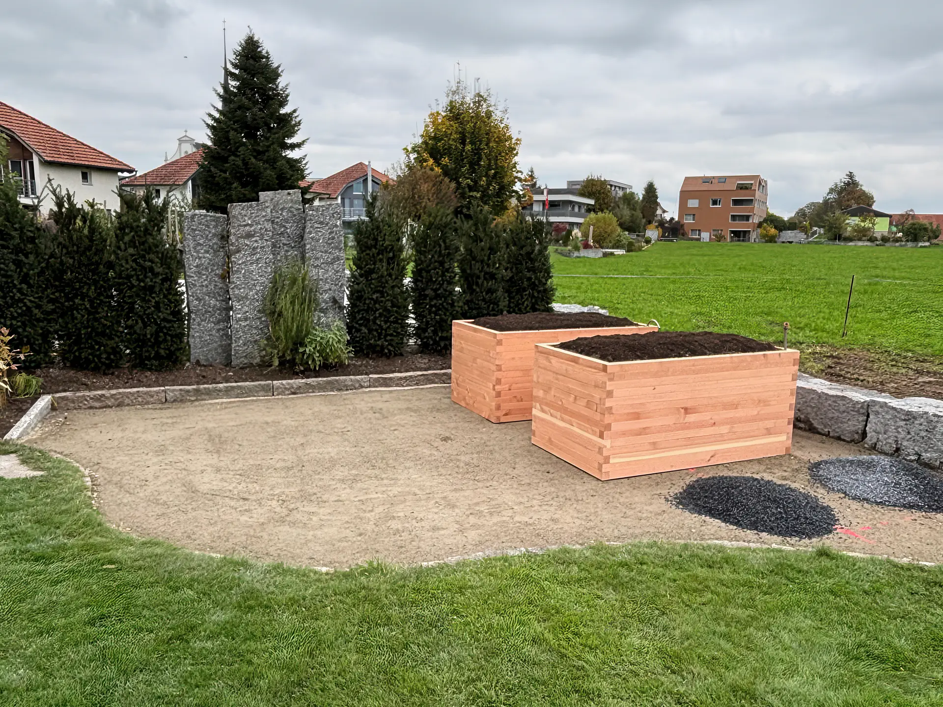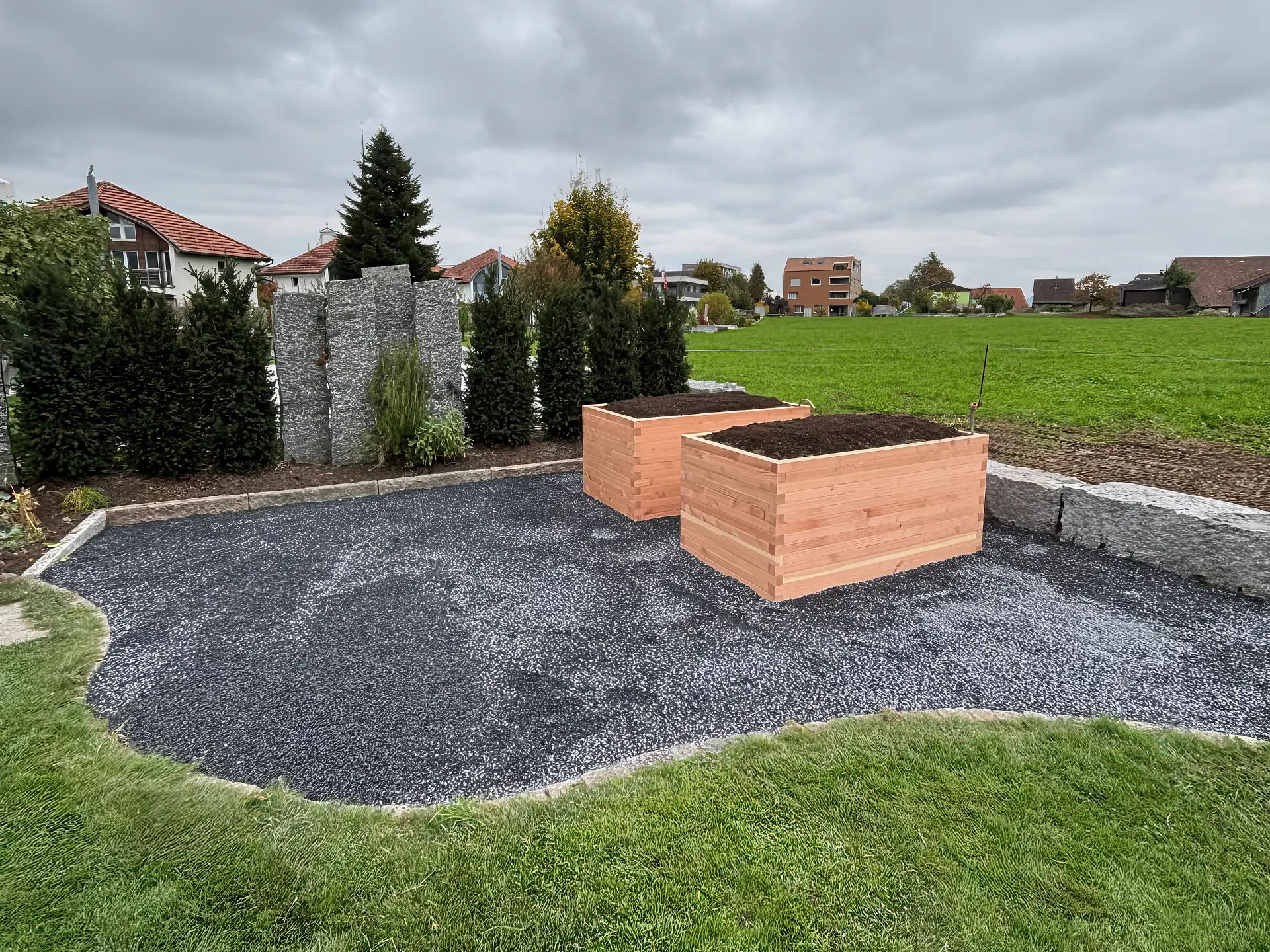 Aus einem alten Gemüsegarten hat Jardin Dominé einen richtig feinen Wohlfühlplatz gemacht. Der neue Sichtschutz aus dichten Eiben sorgt für Ruhe und Privatheit – grün, elegant und toujours chic. Der Boden wurde komplett neu aufgebaut und in einen gemütlichen Kiesplatz verwandelt – perfekt für Loungemöbel, Sommerabende und ein bisschen Savoir-vivre im eigenen Garten. Dazu zwei integrierte Hochbeete, sauber aus Holz gefertigt und bereit für alles, was wächst, duftet oder einfach hübsch aussieht. Ein kleines Garten-Makeover, das zeigt: manchmal steckt viel Charme in wenig Fläche.