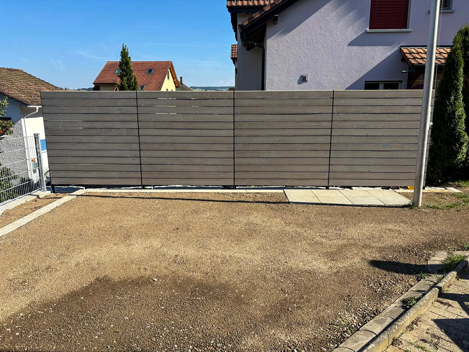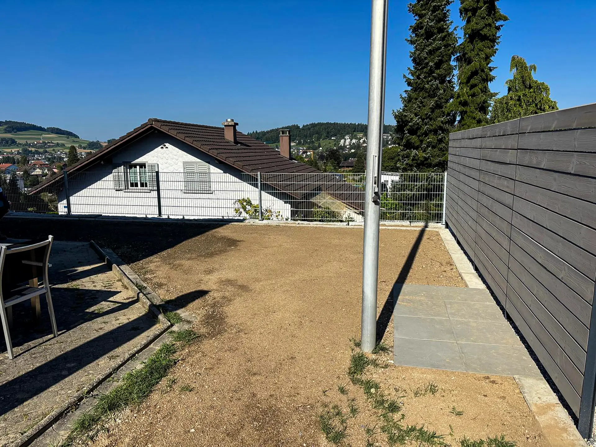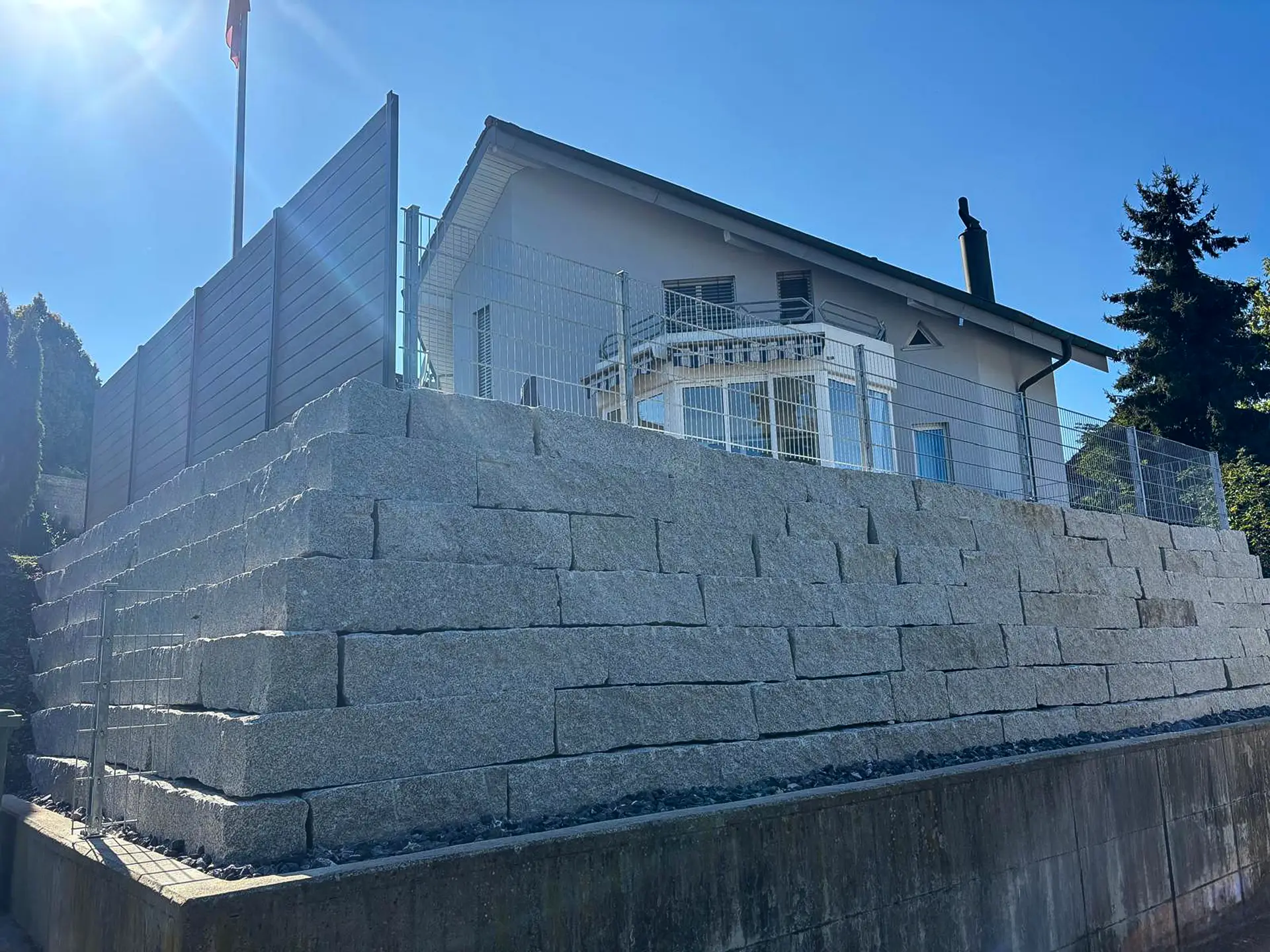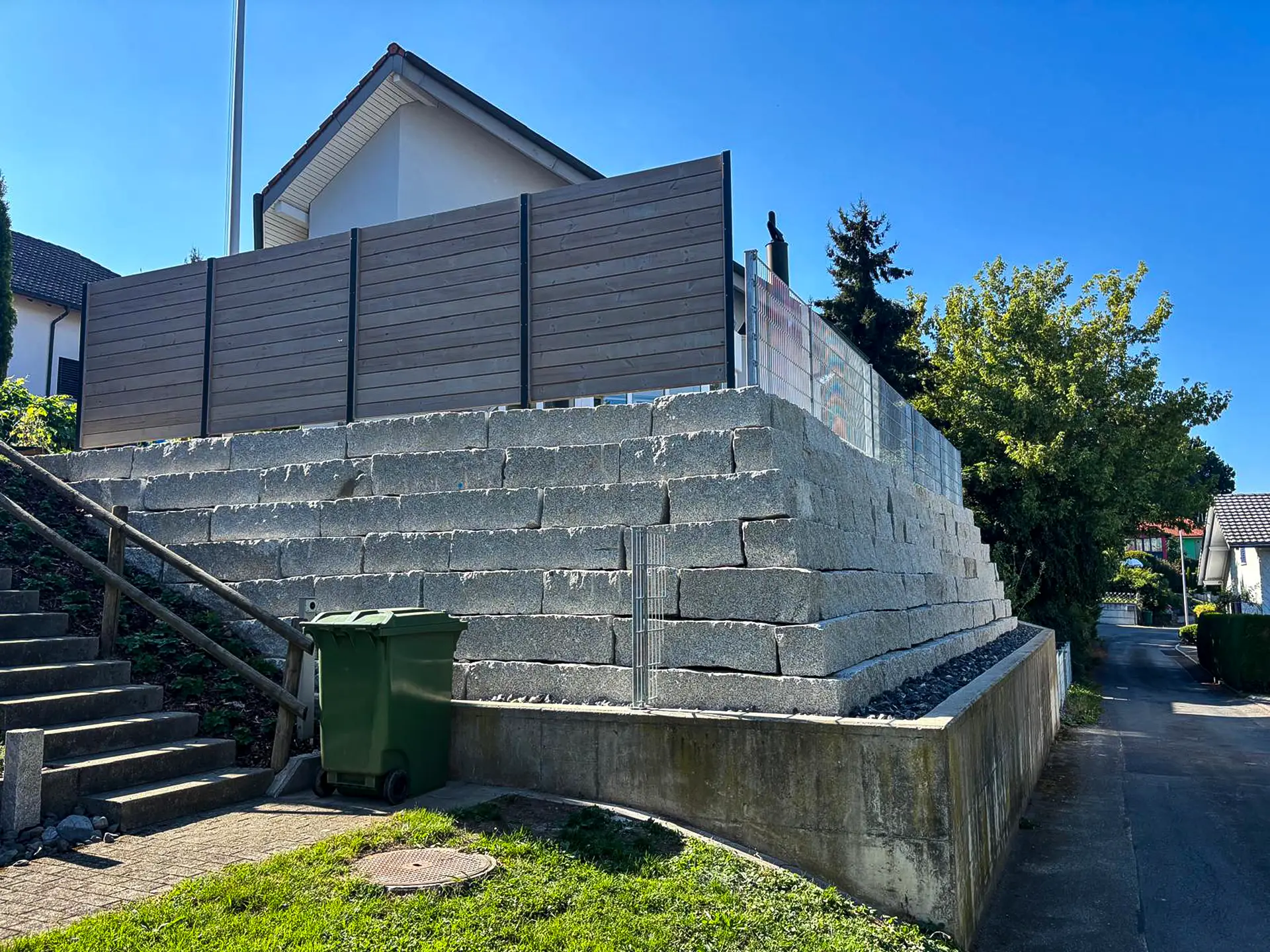 Aus einer überwucherten Böschung wurde hier ein richtig nobles Plätzchen. Jardin Dominé hat alles rausgeräumt, was im Weg stand – und stattdessen eine kräftige Granitsteinmauer gesetzt. Stabil, schön und très solide. Oben drauf: moderne Sichtschutzwände für mehr Privatsphäre und eine Absturzsicherung, die nicht nur sicher, sondern auch sauber integriert ist. Das Resultat? Mehr Fläche, mehr Nutzung, mehr Freude – einfach parc’que beau. Ein vorher–nachher, das zeigt: manchmal muss erst einiges weg, damit etwas richtig Gutes entstehen kann.