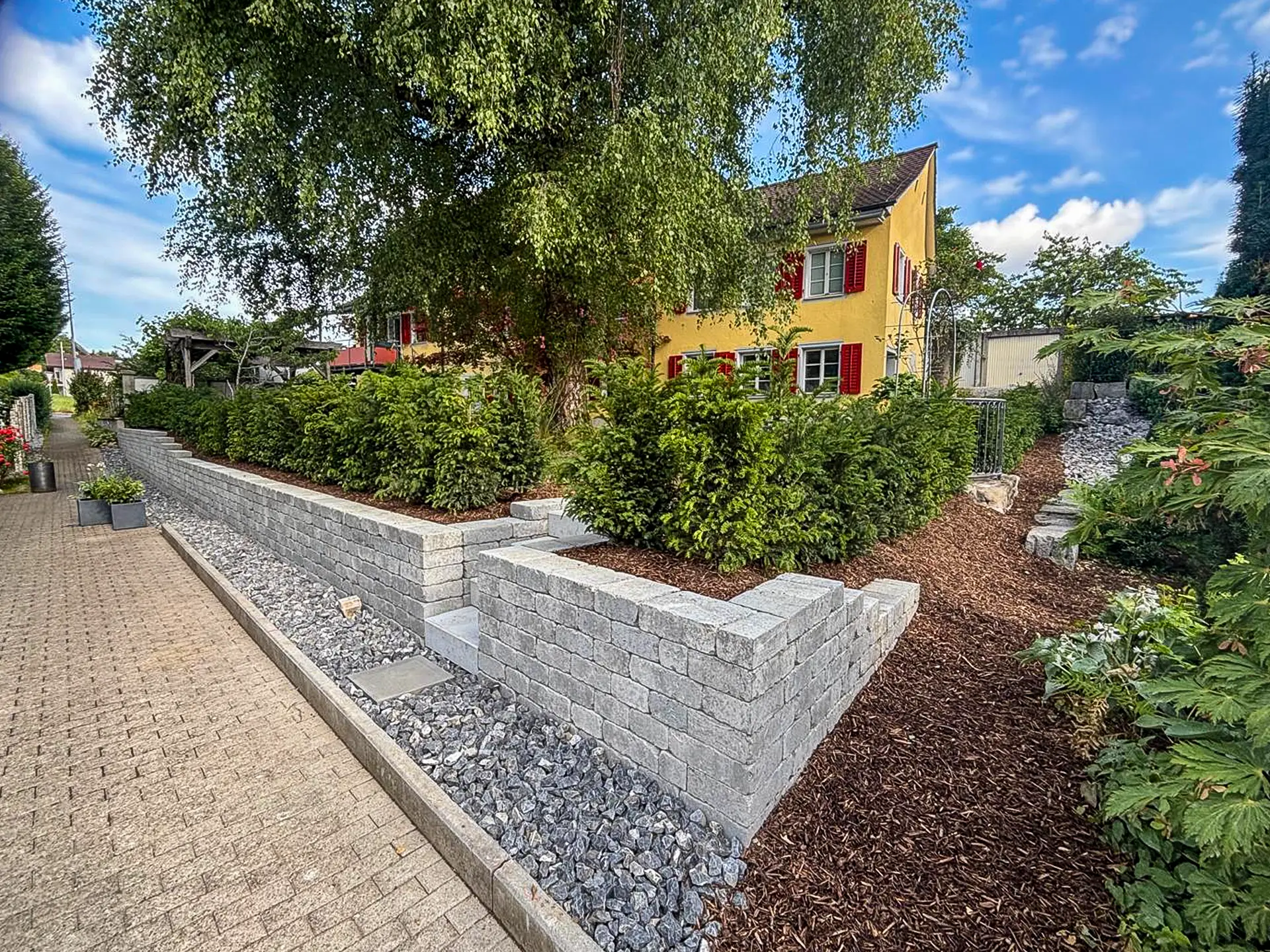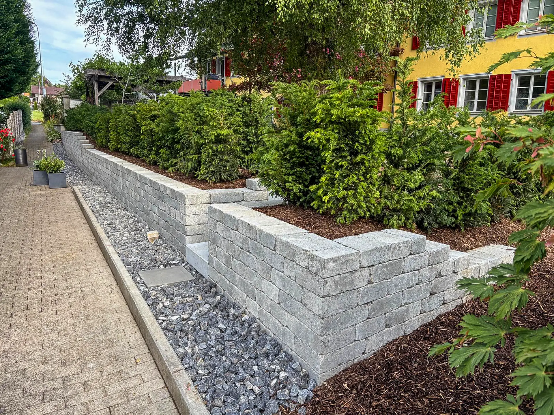 Die alte Thujahecke? Hopp, weg damit! Jardin Dominé hat Platz geschaffen für etwas mit Stil. Anstelle des grünen Dickichts steht jetzt eine saubere Stützmauer aus CUATTRO-Steinen – formschön, stabil und richtig chic. Dazu ein eingebauter Aufgang, frisch gemulchte Beete und eine neue Heckenbepflanzung mit Eiben, die in ein paar Jahren sagt: «Regardez, jetzt sind wir die Chefs hier!»